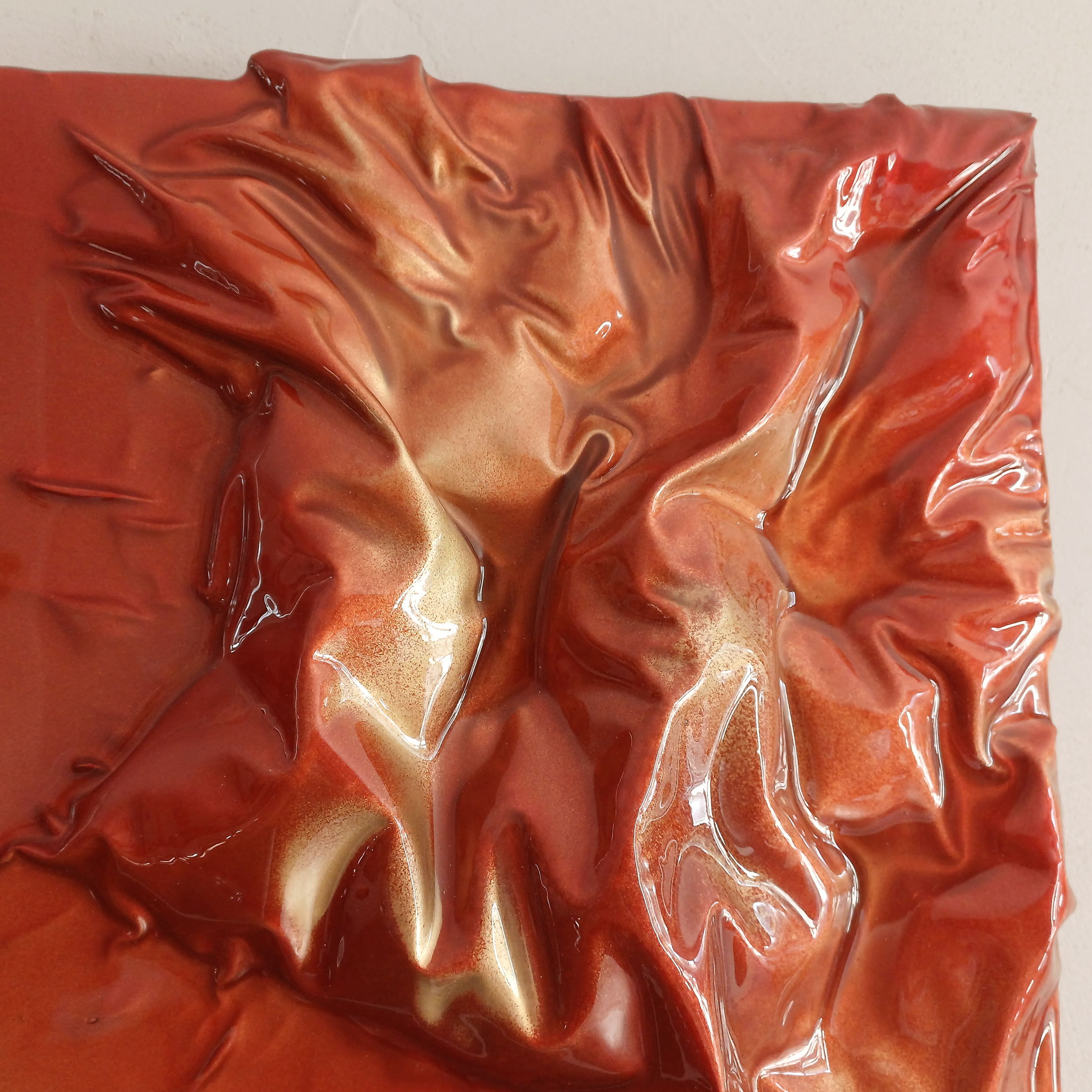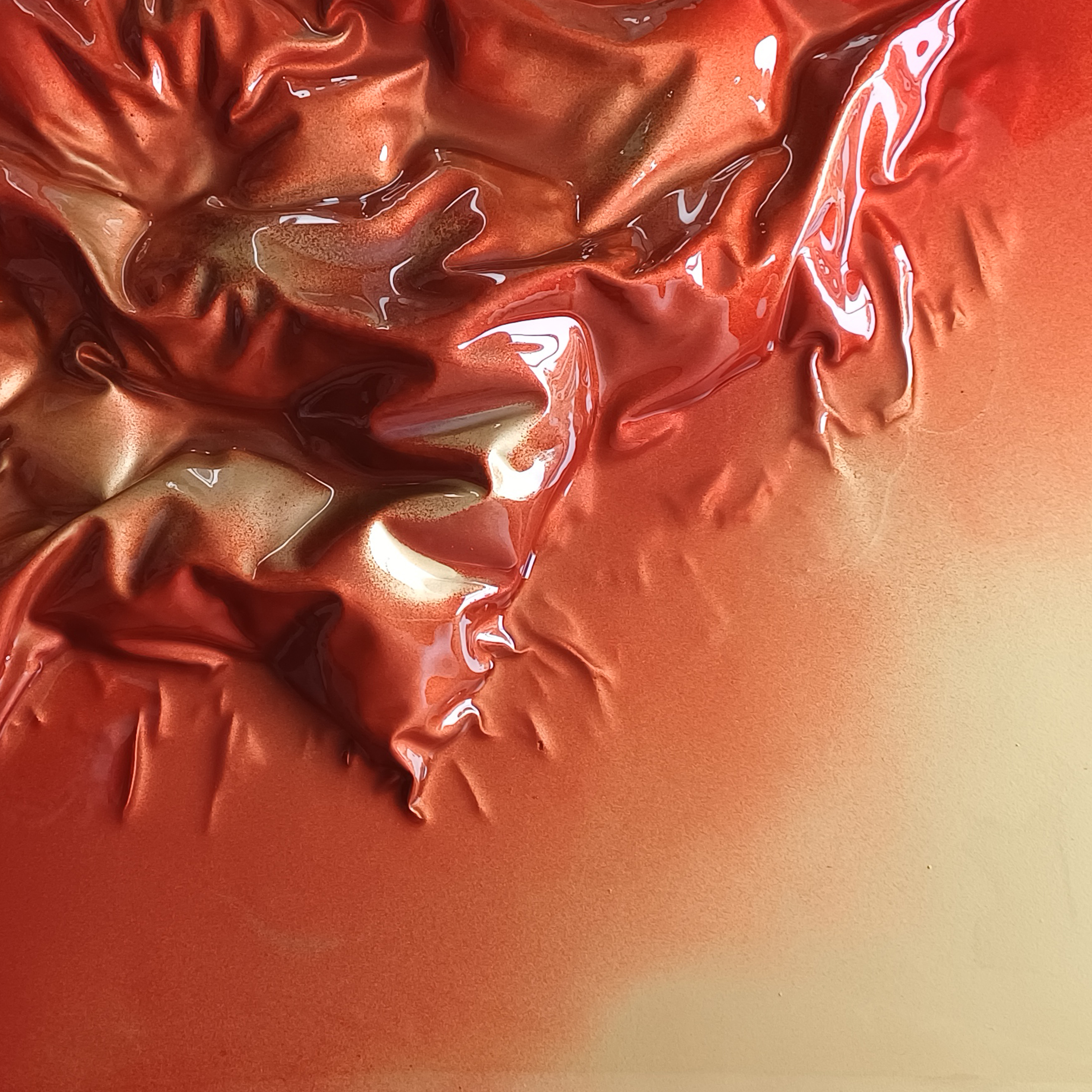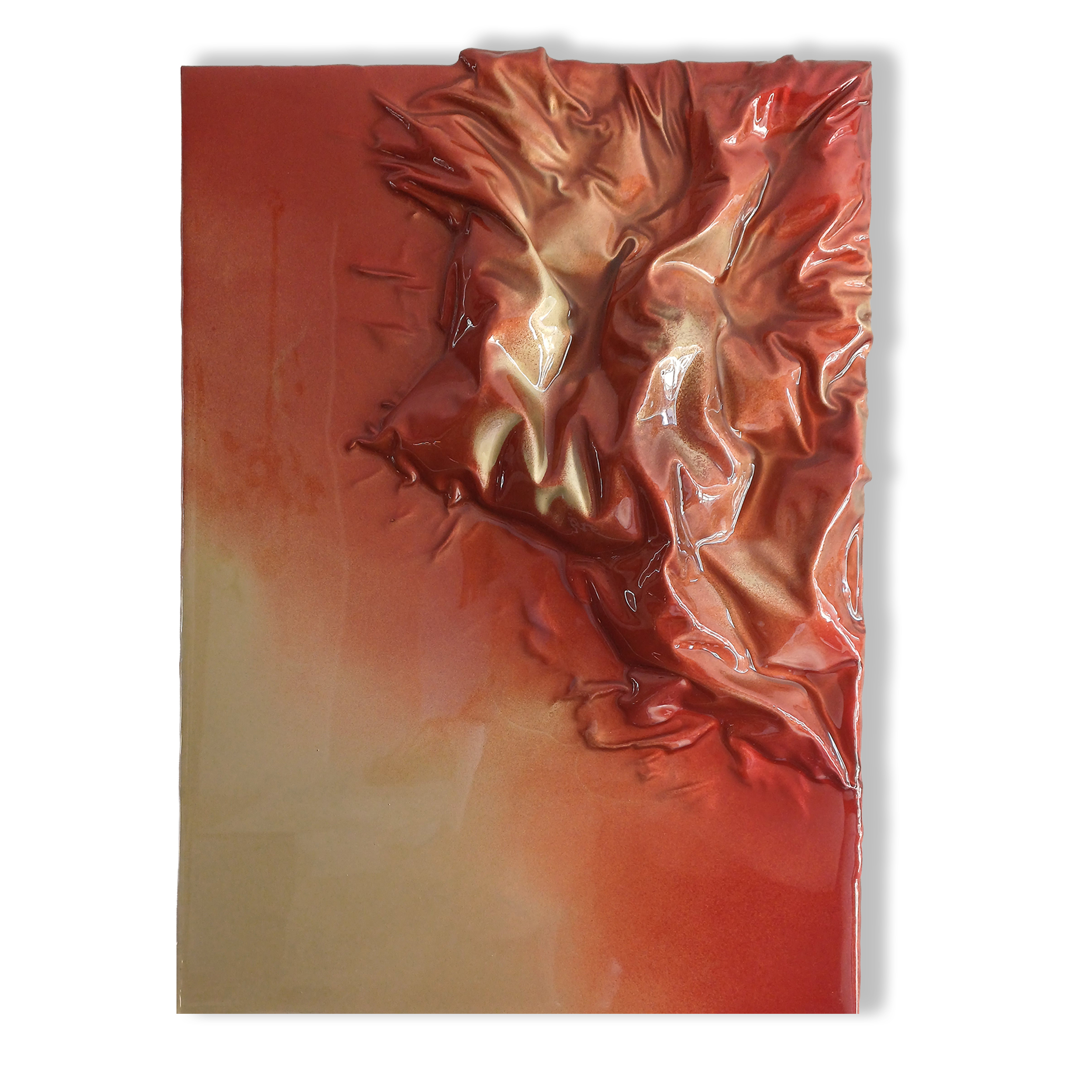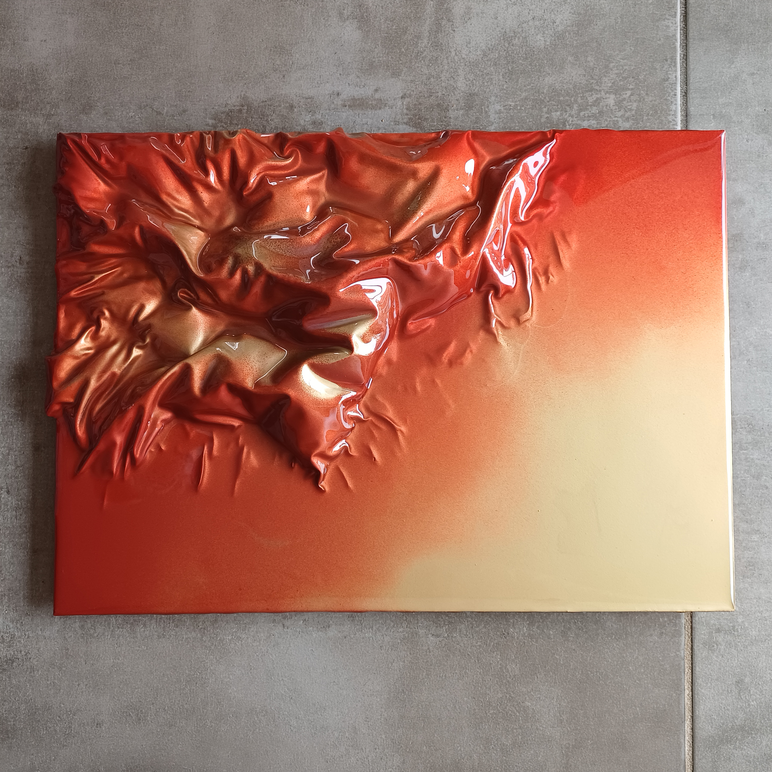 Flare is a chromatic explosion frozen in matter. This work explores pure energy through a tormented relief, where the plaster appears to melt beneath a layer of incandescent resin. The dialogue between deep red and golden highlights evokes a solar flare.