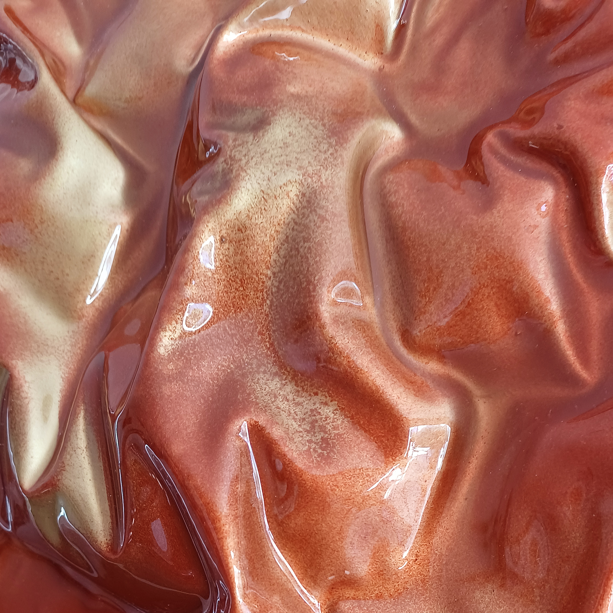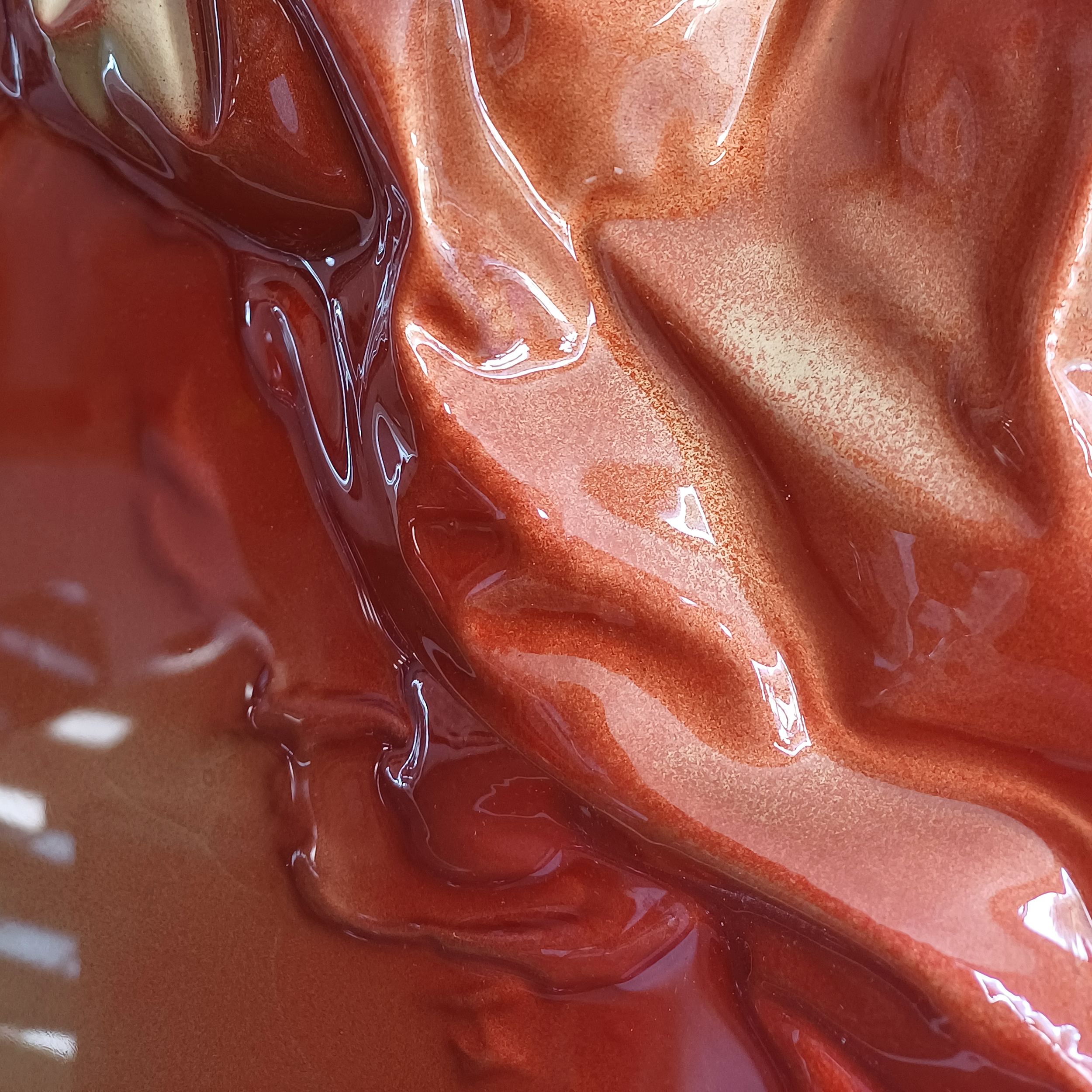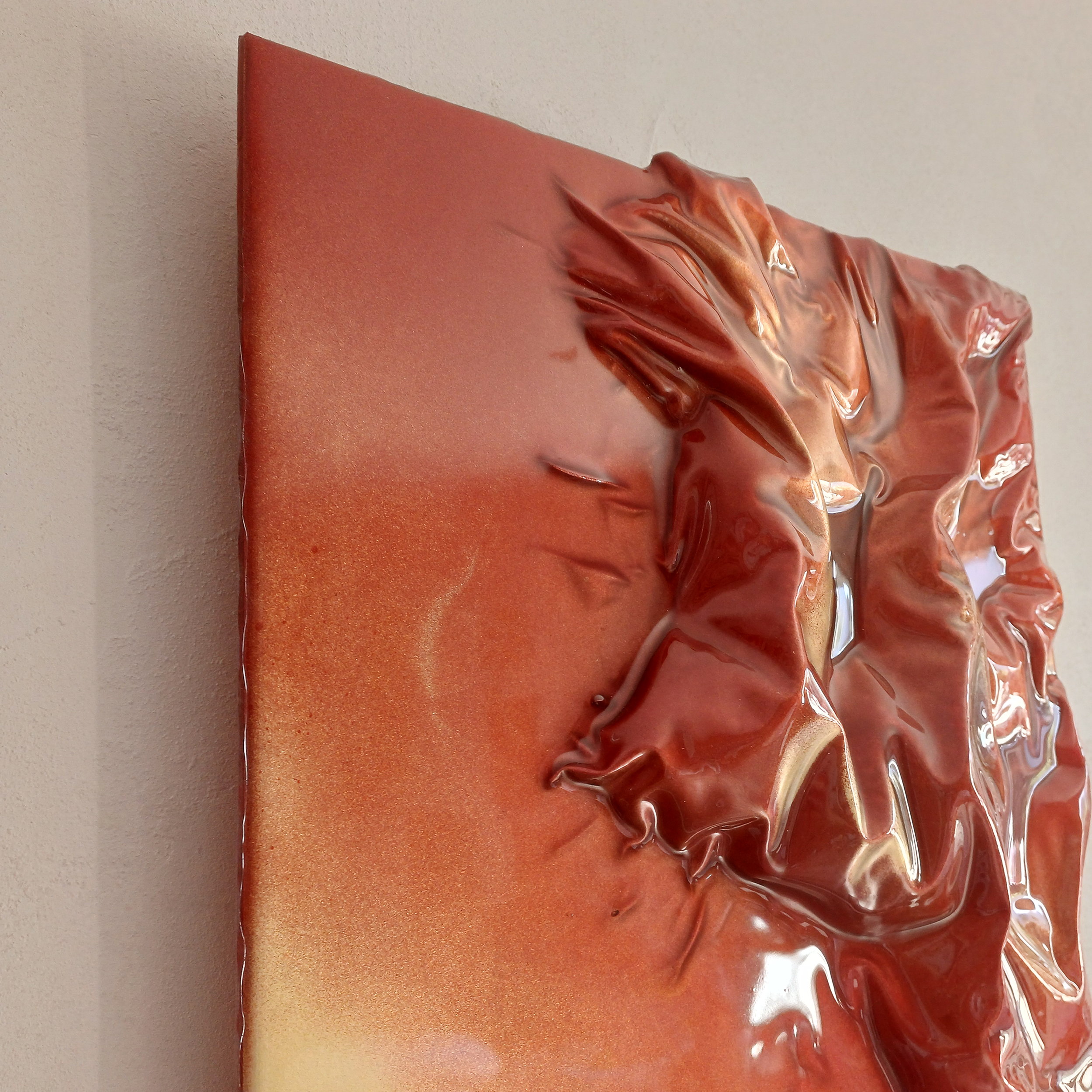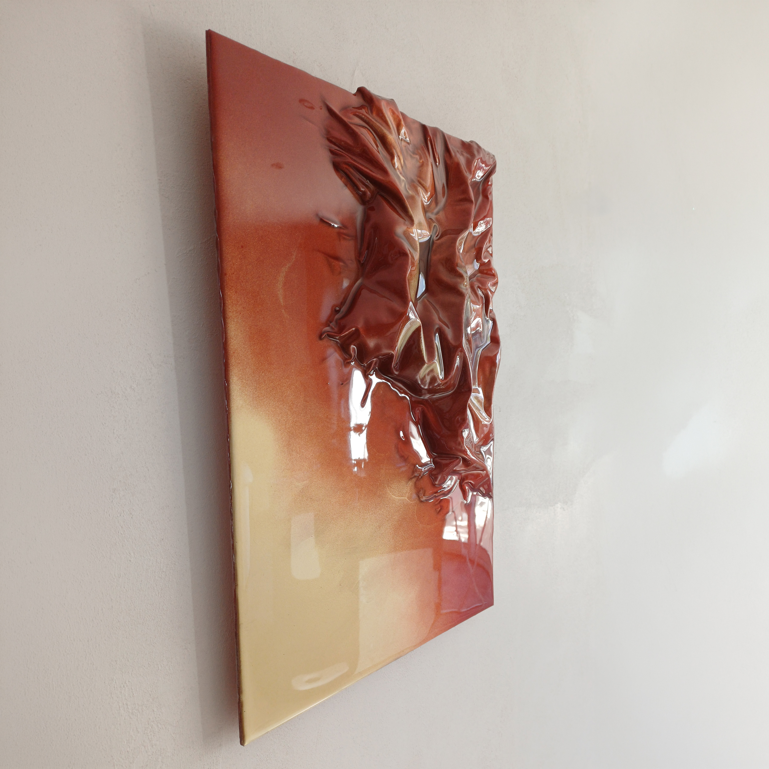 Flare is a chromatic explosion frozen in matter. This work explores pure energy through a tormented relief, where the plaster appears to melt beneath a layer of incandescent resin. The dialogue between deep red and golden highlights evokes a solar flare.