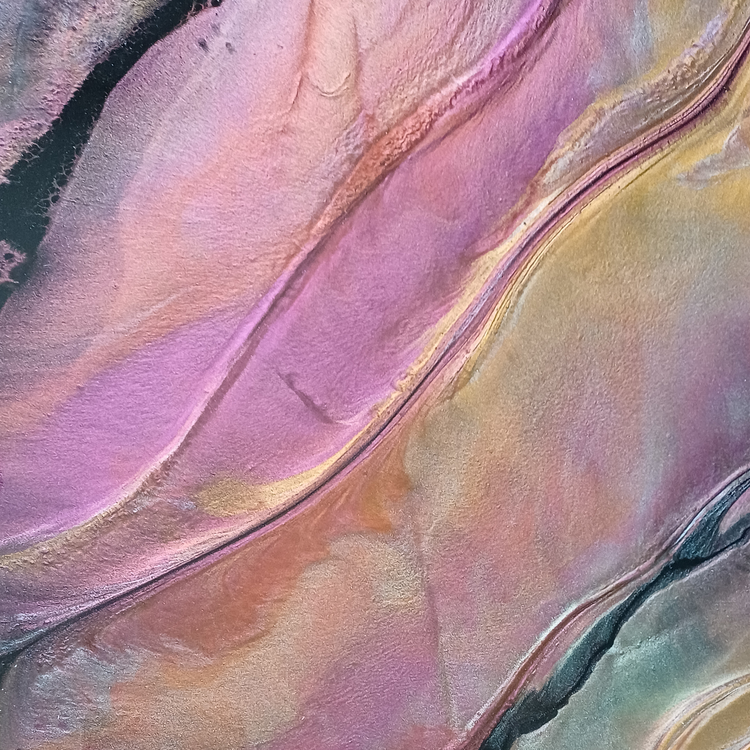 Format 30 × 40 cm, pièce unique aux nuances d’orange, rose et noir.
